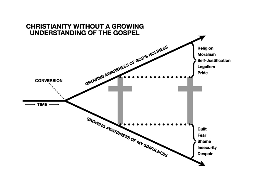The image above is a diagram created by Paul Miller called “the Cross Chart,” and it is one helpful way of understanding growth in the Christian life. As you grow, your estimation of God’s holiness increases, your estimation of yourself decreases, and your appreciation for the Gospel of grace expands to fill the gap. These three things are not objectively changing, but your awareness of them is. (If you leave off or distort one of those three elements of the chart, you’re in trouble.)